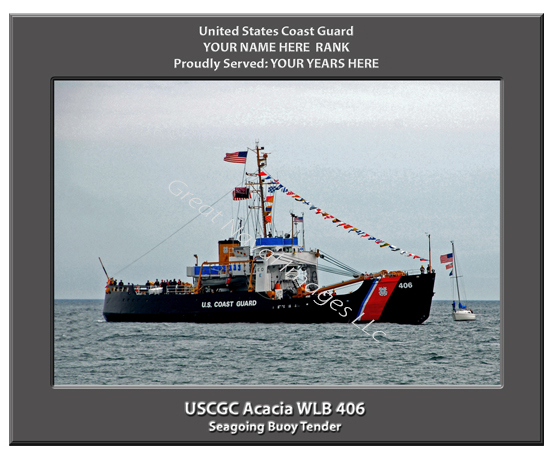 We PERSONALIZE your print of the USCGC Acacia WLB 406 with your name, rank and years served and there is NO ADDITIONAL CHARGE for this option. For example:
