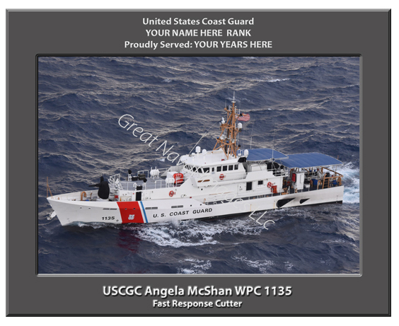 We PERSONALIZE your print of the USCGC Angela McShan WPC 1135 with your name, rank and years served and there is NO ADDITIONAL CHARGE for this option. For example: