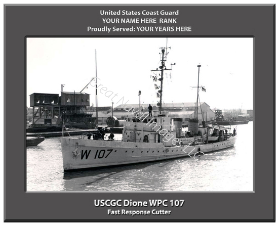 We PERSONALIZE your print of the USCGC Dione WPC 107 with your name, rank and years served and there is NO ADDITIONAL CHARGE for this option. For example: