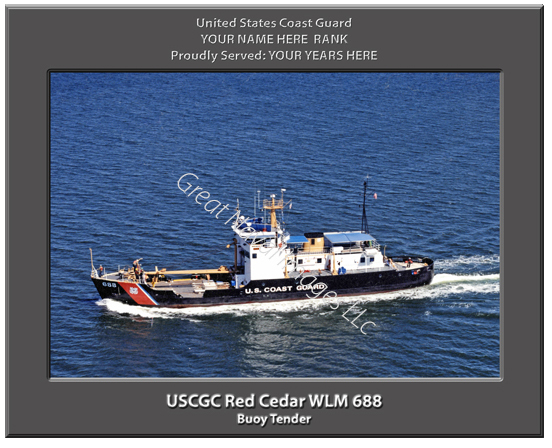 We PERSONALIZE your print of the USCGC Red Cedar WLM 688 with your name, rank and years served and there is NO ADDITIONAL CHARGE for this option. After you place your order, you can simply email us or indicate in the notes section of your payment what you would like printed. For example: