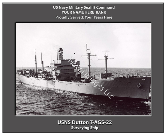 We PERSONALIZE your print of the USNS Dutton T-AGS 22 with your name, rank and years served and there is NO ADDITIONAL CHARGE for this option. After you place your order, you can simply email us or indicate in the notes section of your payment what you would like printed. For example: