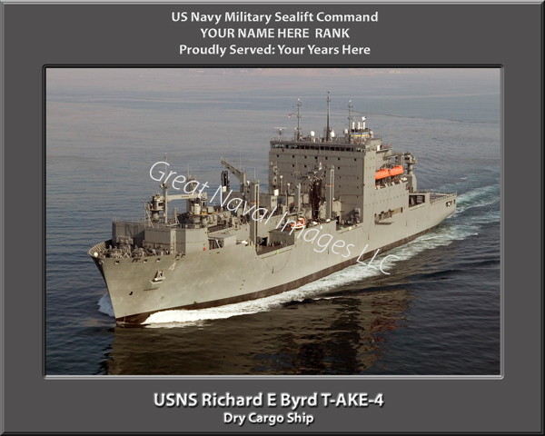 We PERSONALIZE your print of the USNS Richard E Byrd T-AKE 4 with your name, rank and years served and there is NO ADDITIONAL CHARGE for this option. After you place your order, you can simply email us or indicate in the notes section of your payment what you would like printed. For example: