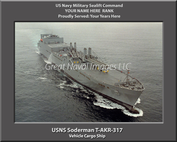 We PERSONALIZE your print of the USNS Soderman T-AKR 317 with your name, rank and years served and there is NO ADDITIONAL CHARGE for this option. After you place your order, you can simply email us or indicate in the notes section of your payment what you would like printed. For example: