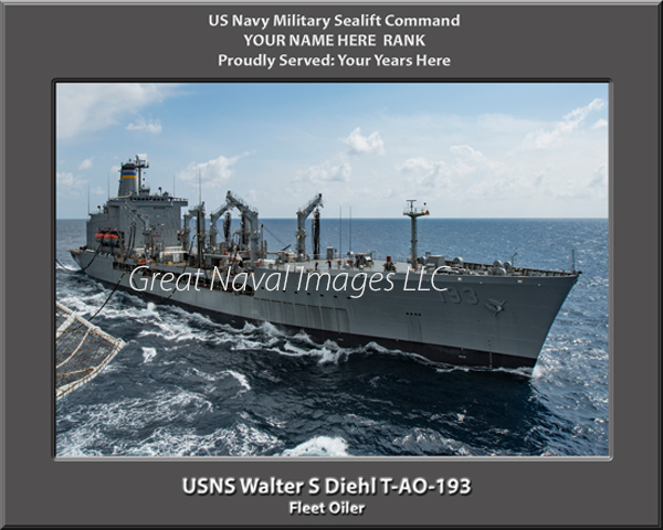 We PERSONALIZE your print of the USNS Walter S Diehl T-AO 193 with your name, rank and years served and there is NO ADDITIONAL CHARGE for this option. After you place your order, you can simply email us or indicate in the notes section of your payment what you would like printed. For example: