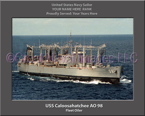 We PERSONALIZE your print of the USS Caloosahatchee AO 98 with your name, rank and years served and there is NO ADDITIONAL CHARGE for this option. After you place your order you can simply email us or indicate in the notes section of your payment what you would like printed. For example: