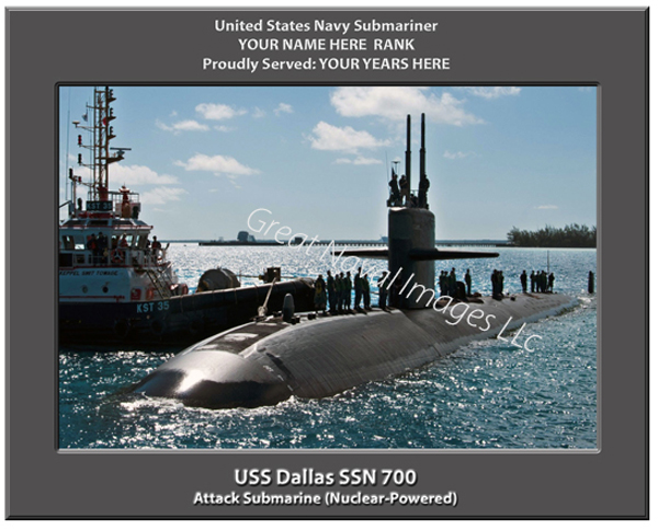 We PERSONALIZE your print of the USS Dallas SSN 700 with your name, rank and years served and there is NO ADDITIONAL CHARGE for this option. After you place your order, you can simply email us or indicate in the notes section of your payment what you would like printed. For example: