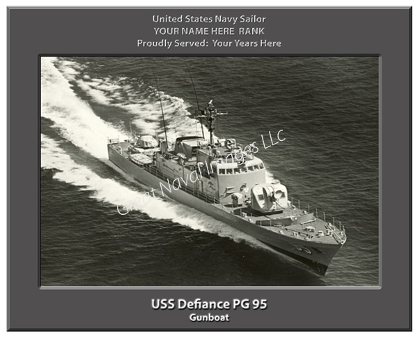 We PERSONALIZE your print of the USS Defiance PG 95 with your name, rank and years served and there is NO ADDITIONAL CHARGE for this option. After you place your order, you can simply email us or indicate in the notes section of your payment what you would like printed. For example: