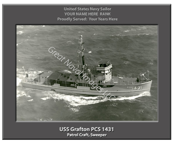 We PERSONALIZE your print of the USS Grafton PCS 1431 with your name, rank and years served and there is NO ADDITIONAL CHARGE for this option. After you place your order, you can simply email us or indicate in the notes section of your payment what you would like printed. For example: