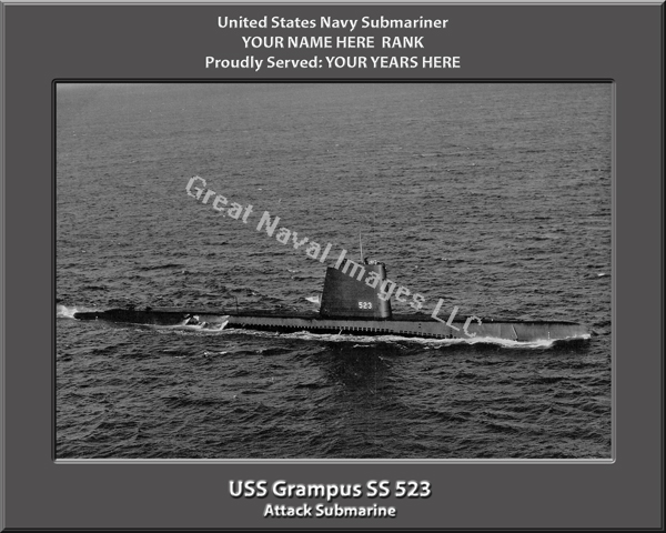 We PERSONALIZE your print of the USS Grampus SS 523 with your name, rank and years served and there is NO ADDITIONAL CHARGE for this option. After you place your order, you can simply email us or indicate in the notes section of your payment what you would like printed. For example: