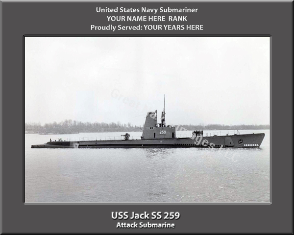 We PERSONALIZE your print of the USS Jack SS 259 with your name, rank and years served and there is NO ADDITIONAL CHARGE for this option. After you place your order, you can simply email us or indicate in the notes section of your payment what you would like printed. For example: