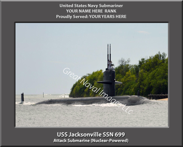 We PERSONALIZE your print of the USS Jacksonville SSN 699 with your name, rank and years served and there is NO ADDITIONAL CHARGE for this option. After you place your order, you can simply email us or indicate in the notes section of your payment what you would like printed. For example: