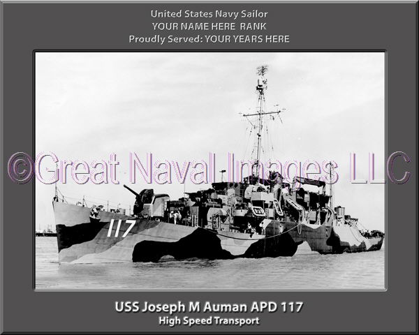 We PERSONALIZE your print of the USS Joseph M Auman APD 117 with your name, rank and years served and there is NO ADDITIONAL CHARGE for this option. After you place your order you can simply email us or indicate in the notes section of your payment what you would like printed. For example: