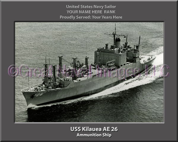 We can PERSONALIZE your print or the USS Kilauea AE 26 with your name, rank and years served and there is no ADDITIONAL CHARGE for this option. After you place your order you can simply email us or indicate in the notes section of your payment what you would like printed. For example:
