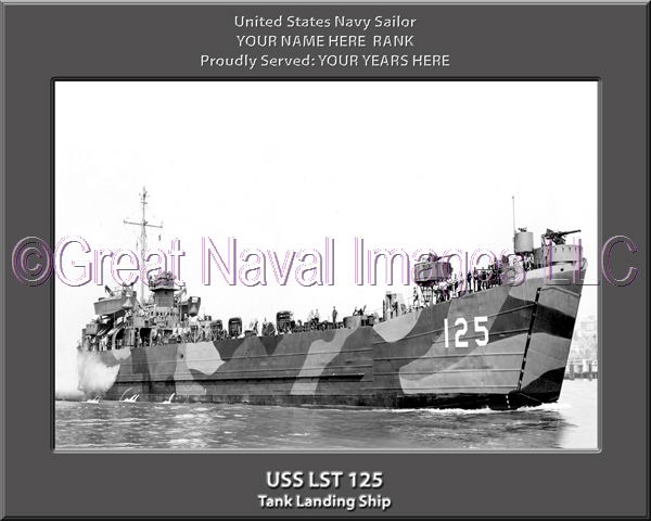 We PERSONALIZE your print of the USS LST 125 with your name, rank and years served and there is NO ADDITIONAL CHARGE for this option. After you place your order you can simply email us or indicate in the notes section of your payment what you would like printed. For example: