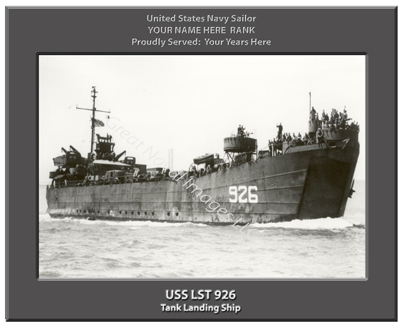 We PERSONALIZE your print of the USS LST 926 with your name, rank and years served and there is NO ADDITIONAL CHARGE for this option. After you place your order, you can simply email us or indicate in the notes section of your payment what you would like printed. For example: