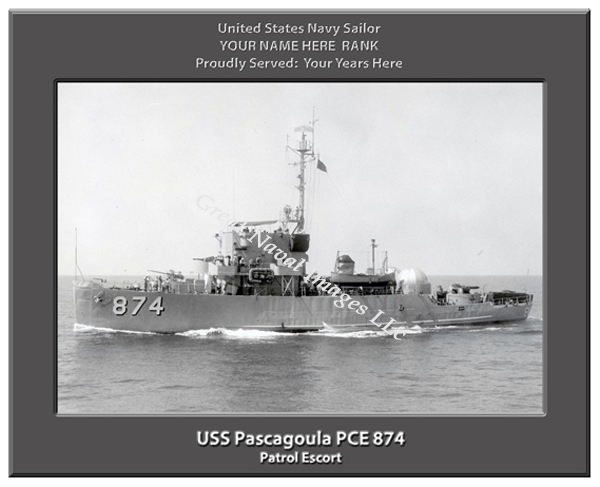 We PERSONALIZE your print of the USS Pascagoula PCE 874 with your name, rank and years served and there is NO ADDITIONAL CHARGE for this option. After you place your order, you can simply email us or indicate in the notes section of your payment what you would like printed. For example: