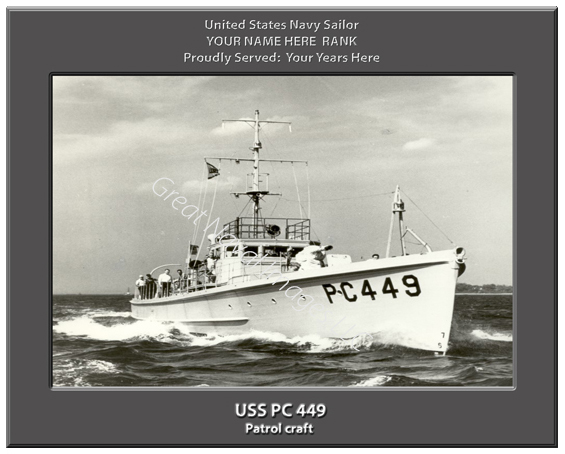 We can PERSONALIZE your print of the USS PC 449 with your name, rank and years served and there is NO ADDITIONAL CHARGE for this option. After you place your order you can simply email us or indicate in the notes section of your payment what you would like printed. For example: