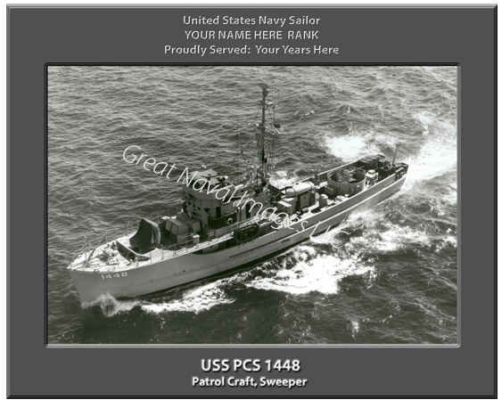 The personalized printed picture of USS PCS 1448 is exactly as you see it. Printed on Canvas for a unique work of art. You have the choice of two print sizes. 8″x10″ or 11″x14″ ready for framing as it is, or you can add an additional matte of your own choosing. The prints are made to order. They look awesome when matted and framed.