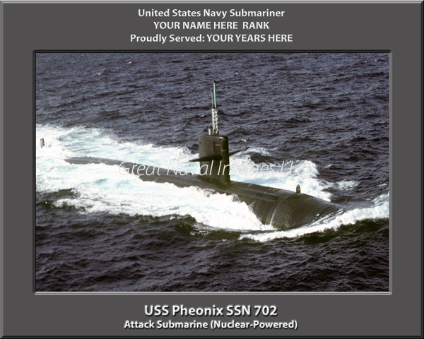 We PERSONALIZE your print of the USS Pheonix SSN 702 with your name, rank and years served and there is NO ADDITIONAL CHARGE for this option. After you place your order, you can simply email us or indicate in the notes section of your payment what you would like printed. For example: