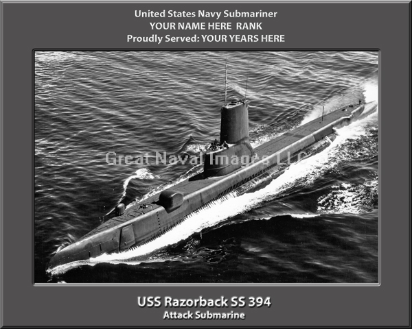 We PERSONALIZE your print of the USS Razorback SS 394 with your name, rank and years served and there is NO ADDITIONAL CHARGE for this option. After you place your order, you can simply email us or indicate in the notes section of your payment what you would like printed. For example: