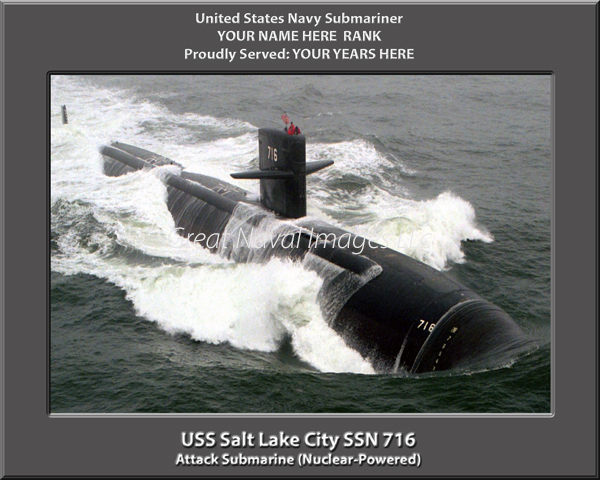 We PERSONALIZE your print of the USS Salt Lake City SSN 716 with your name, rank and years served and there is NO ADDITIONAL CHARGE for this option. After you place your order, you can simply email us or indicate in the notes section of your payment what you would like printed. For example: