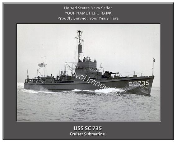 We PERSONALIZE your print of the USS SC 735 with your name, rank and years served and there is NO ADDITIONAL CHARGE for this option. After you place your order, you can simply email us or indicate in the notes section of your payment what you would like printed. For example: