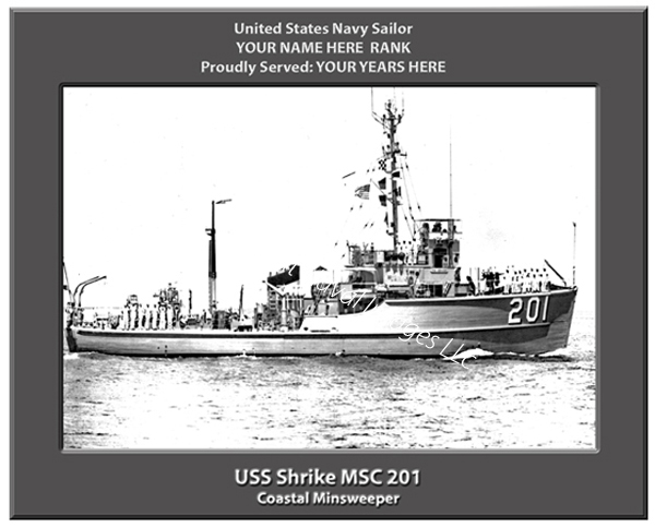 We PERSONALIZE your print of the USS Shrike MSC 201 with your name, rank and years served and there is NO ADDITIONAL CHARGE for this option. After you place your order, you can simply email us or indicate in the notes section of your payment what you would like printed. For example: