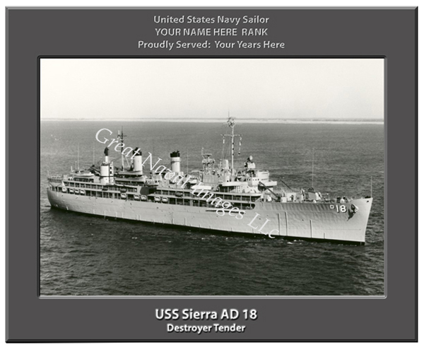 We can PERSONALIZE your print or the USS Sierra AD 18 with your name, rank and years served and there is no ADDITIONAL CHARGE for this option. After you place your order you can simply email us or indicate in the notes section of your payment what you would like printed. For example: