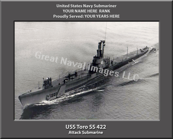 We PERSONALIZE your print of the USS Toro SS 422 with your name, rank and years served and there is NO ADDITIONAL CHARGE for this option. After you place your order, you can simply email us or indicate in the notes section of your payment what you would like printed. For example: