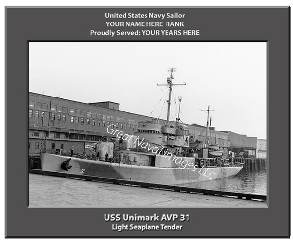 We can PERSONALIZE your print or the USS Unimark AVP 31 with your name, rank and years served and there is no ADDITIONAL CHARGE for this option. After you place your order, you can simply email us or indicate in the notes section of your payment what you would like printed. For example: