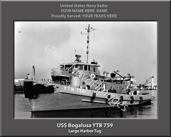 We can PERSONALIZE your print or the USS Bogalusa YTB 759 with your name, rank and years served and there is no ADDITIONAL CHARGE for this option. After you place your order, you can simply email us or indicate in the notes section of your payment what you would like printed. For example: